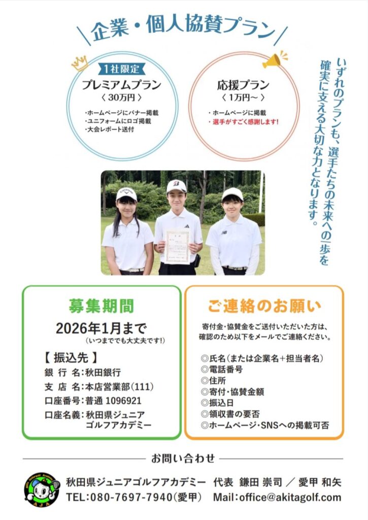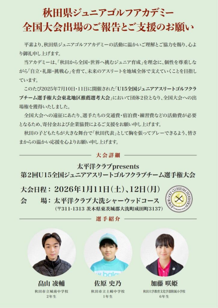 秋田県ジュニアゴルフアカデミー全国大会出場決定のご報告とご協賛のお願い