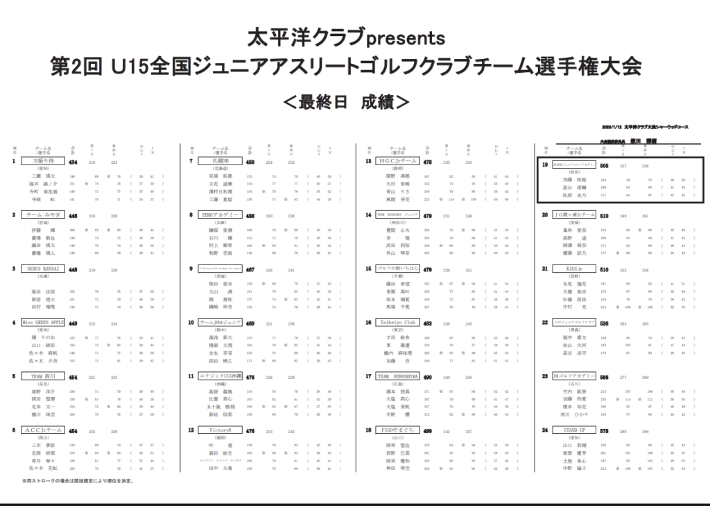U15全国ジュニアアスリートゴルフクラブチーム選手権大会のご報告とお礼